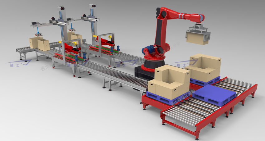 本生產線包含紙箱成型、自動裝箱、封箱、打包、機器人碼垛、自動托盤庫等設備。適合于各種大、中型包裝生產線。適用于各種包裝容器,可包裝塑料扁瓶、圓瓶、不規(guī)則形瓶、各種大小玻璃瓶,圓瓶、橢圓形瓶、方形罐及紙罐等。裝箱機采用P.L.C+觸摸顯示屏控制。設有缺瓶不裝箱,無瓶不裝箱等安全裝置,穩(wěn)定的伺服裝置,使設備在運行中更加高率。碼垛機將產品按一定排列碼放在托盤上,進行自動堆碼。本流水線大大方便操作、管理、減少生產人員和勞動強度,是自動化規(guī)模生產必不可少的設備。